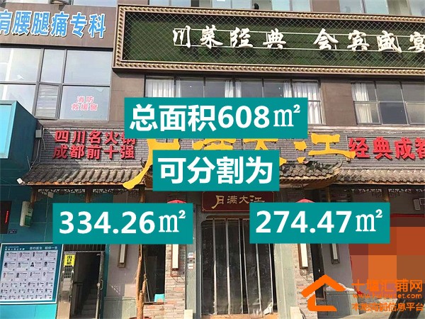 ①:原北京中路月满大江,总面积608㎡,店内精装修,全屋中央空调覆盖,店面格局方正,户外另有超大门头可使用!所有餐饮设备齐全,餐饮行业接手就可直接经营!面积也可分割为334.32㎡与274.47㎡两大板块,月租金75元/㎡/月(诚心可谈),整租价位更有优惠!也可经营其他项目,行业无限制!